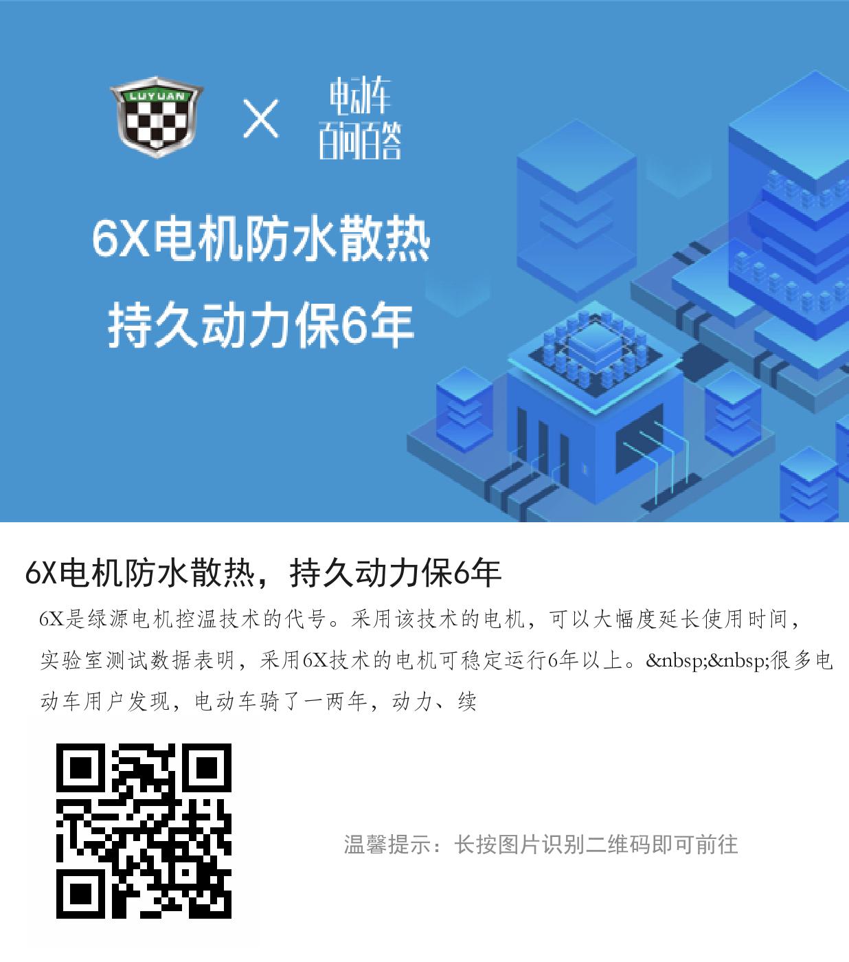 6X是绿源电机控温技术的代号。采用该技术的电机,可以大幅度延长使用时间,实验室测试数据表明,采用6X技术的电机可稳定运行6年以上。