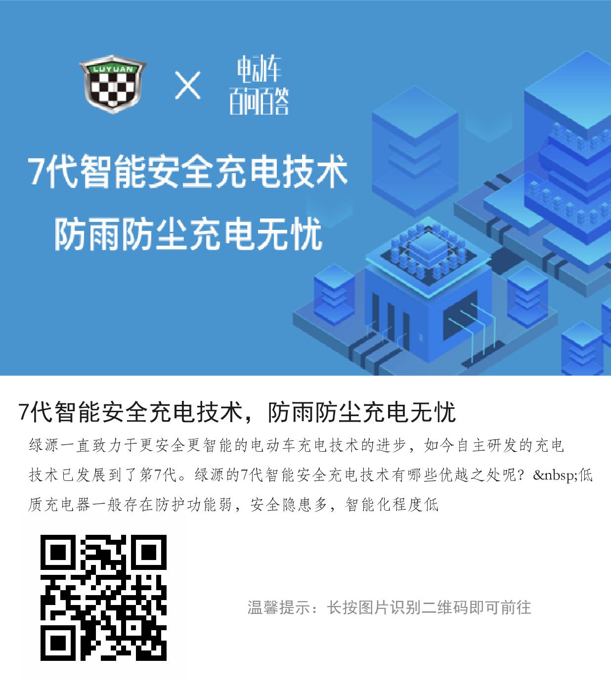 绿源7代智能充电技术,采用双轴承微型风机设计,70000小时高效散热,风机寿命是普通充电器的20倍,有效降低了由于风机问题导致的充电器故障,最大限度预防充电火灾事故。同时,改进防尘滤网、双导流槽等设计,有出色的防潮、防雨、防尘功能。此外,置入单片机程序控制芯片,可自动识别充电状态,拥有充电保护功能,充满电后,会自动切断输出电源,能更安全更高效的完成充电。